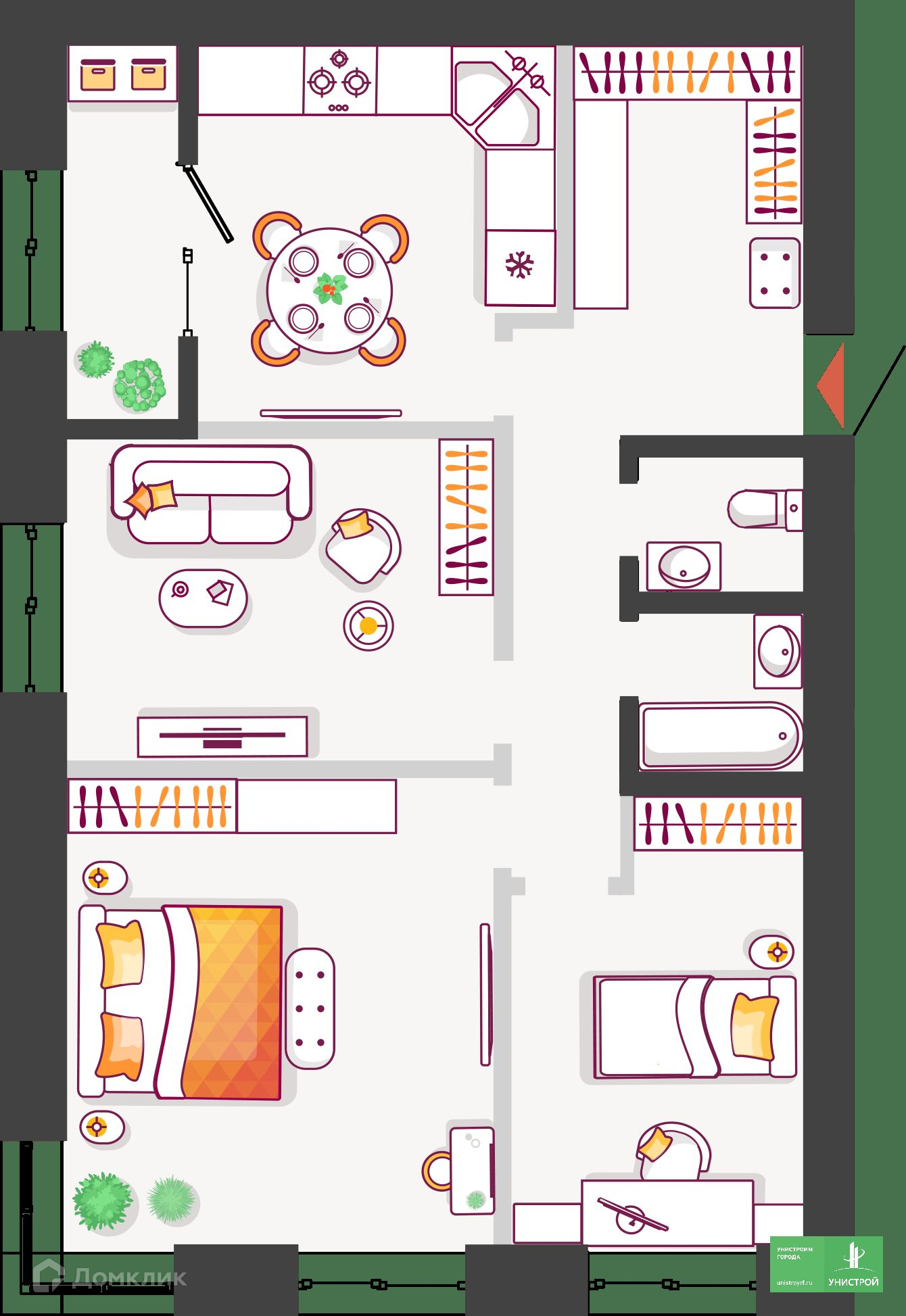 Новый дом приятно удивит вас необычной концепцией и экологичным благоустройством. Гармоничное городское пространство, стильная архитектура, двор-парк. Современная среда, закрытая от машин и доступа посторонних с фонтаном и лаунж-зоной во дворе для ценителей комфорта, удобства расположения, современных инженерных решений и высокого качества строительства от надежного застройщика «Унистрой». Новый микрорайон Жилой комплекс расположен в Автозаводском районе Тольятти. В 10 минутах езды от Южного бульвара – спортивный комплекс «Лада-Арена», торговые центры «Акварель», «Капитал», строительный магазин «Леруа Мерлен». Рядом с ЖК – остановка общественного транспорта «Ул. Полякова», откуда можно уехать в любой район города, поликлиника №3. В Южном бульваре расположен детский сад №116, рядом – гимназия №77. На территории комплекса ведется проектирование второго детского сада и дополнительных двух внутриквартальных дорог, которые позволят выехать на Южное шоссе и быстро добраться до любой точки города, загород в выходные. Двор-парк Новый дом, как и весь проект ЖК, будет реализован в сегменте комфорт-класса, но наделен принципиально новыми для города особенностями. Новинкой дома станет уютный двор-парк. Пространство будет закрыто от машин и доступа посторонних. Зайти на территорию смогут только жители и их гости. Двор будет оборудован охраной и видеонаблюдением. Вы сможете с экрана телефона наблюдать, как играют ваши дети во дворе. Для приватного отдыха, работы на свежем воздухе и встреч с друзьями будет лаунж-зона с фонтаном и разнообразным озеленением. Для прогулок с детьми – экологичные игровые пространства с использованием дерева, гальки, щепы, песка. Стильный дом Мы спроектировали входы в подъезды и двор без пандусов и ступеней, чтобы вам было удобно гулять с коляской. Привычное пространство первых этажей будет наполнено новыми стилевыми решениями. На первых этажах каждого подъезда мы установили колясочные комнаты с велопаркингом. Санки, велосипеды, коляски не будут занимать место в вашей квартире. В доме будут установлены бесшумные лифты и удобная навигация. Террасы, теплые лоджии, евродвушки В новом доме представлено большое разнообразие планировочных решений. Эксклюзивный формат квартир с террасами во дворах позволит создать уютное место для летних завтраков. Для удобства в солнечные и дождливые дни предусмотрены теневые навесы – маркизы. Балконы в новом доме заменили теплые лоджии, которые делают помещение полезным и позволяют его использовать круглый год. Теплые лоджии освобождают вас от необходимости утепления помещения и установки дополнительных отопительных приборов. На теплой лоджии можно оборудовать небольшой спортзал, рабочий кабинет или зону отдыха. Также в доме есть студии, 1-комнатные, евродвушки, 2- и 3-комнатные квартиры. Современные решения Все квартиры будут сдаваться в качественной предчистовой отделке. Горизонтальная разводка отопления (трубы спрятаны в полу) позволит воплотить все дизайнерские решения. Показания приборов учета воды, электричества тепла будут автоматически подаваться в Сервисную компанию. Решение удобно еще и тем, что 24/7 ведется мониторинг расхода всех ресурсов. И в случае чрезмерного расхода, к примеру, воды, специалисты смогут перекрыть ее без доступа в квартиру, в общем 