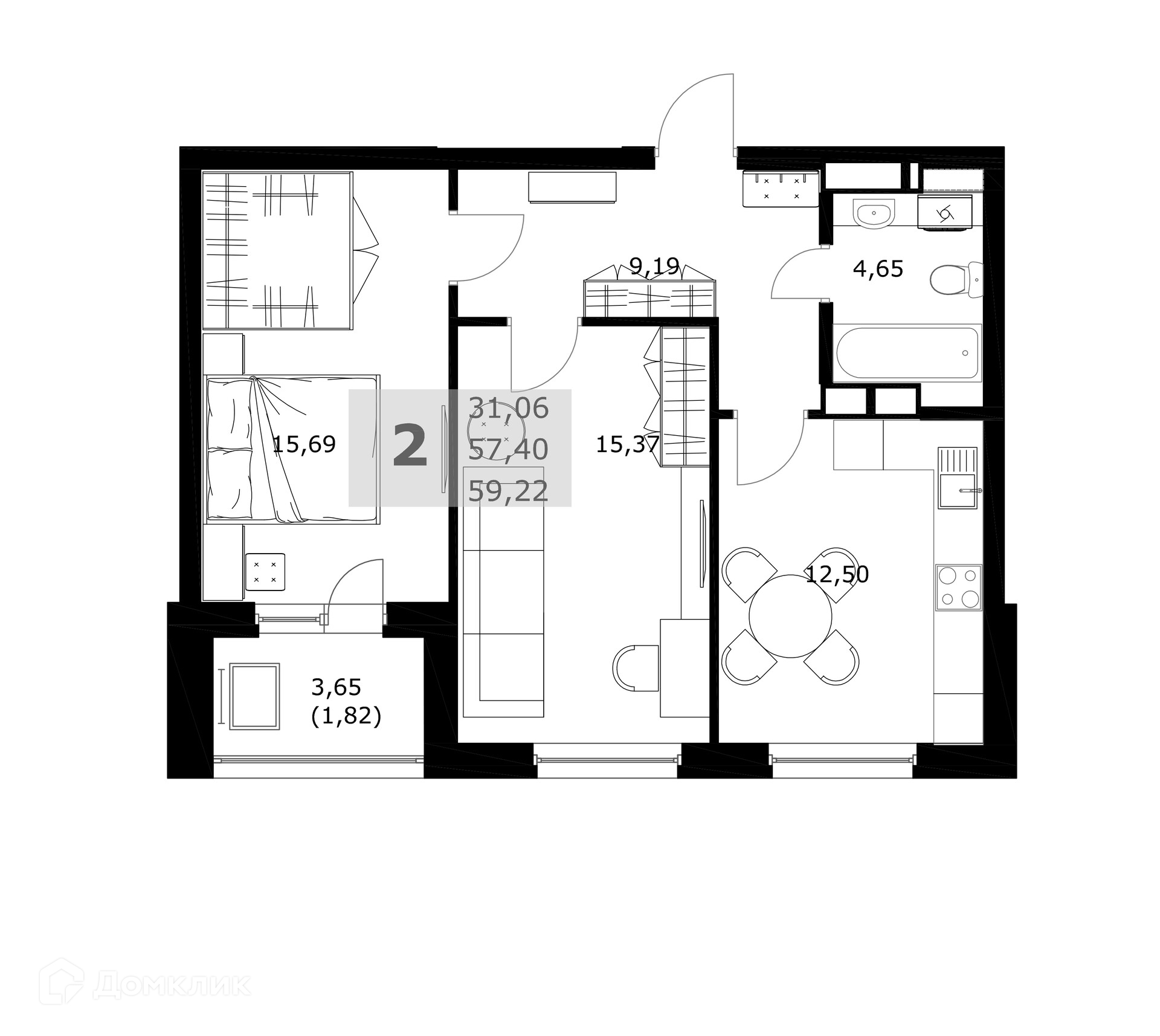 - Общая площадь: 59.22 м²