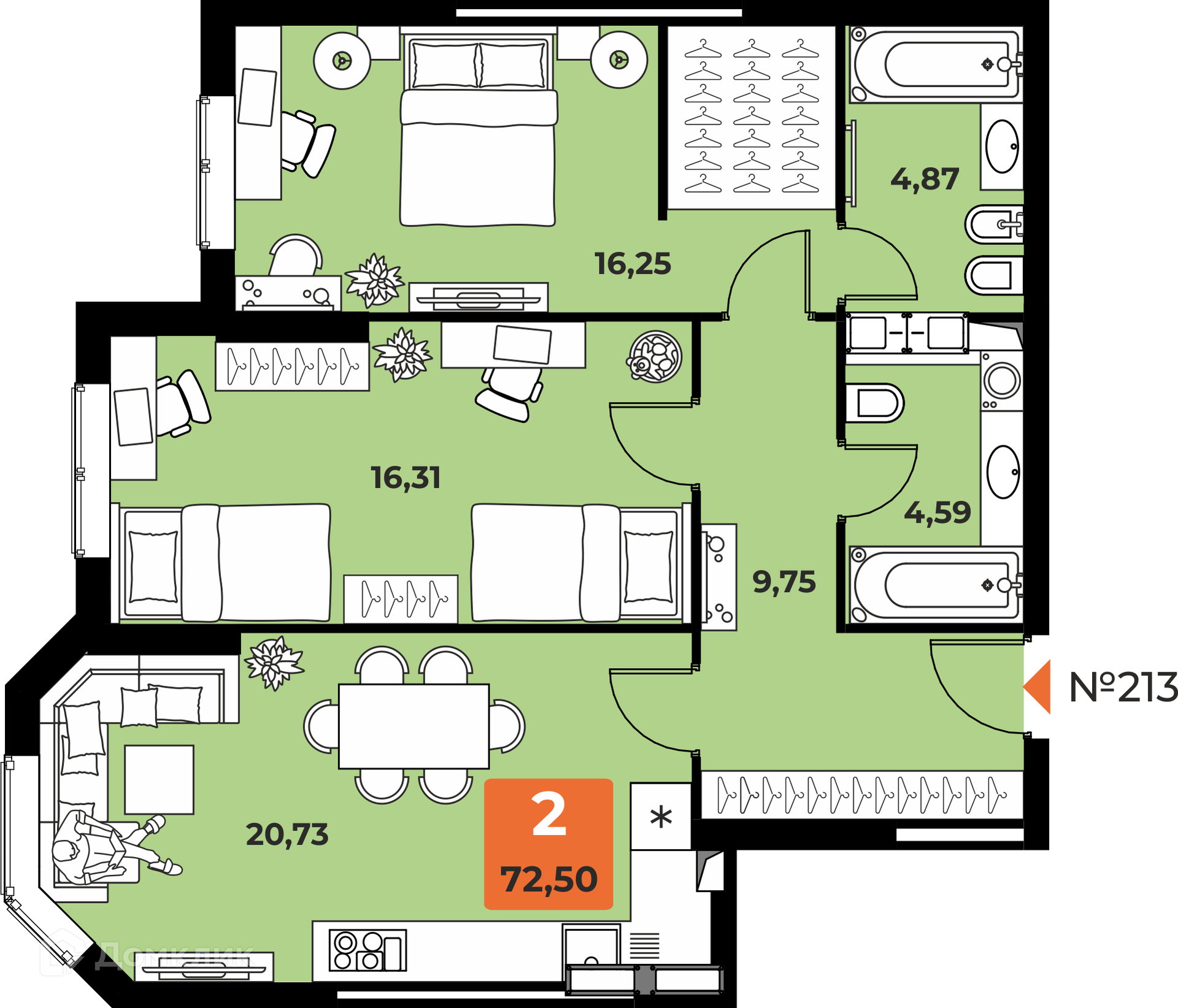 - ✅ Кухня: 20.73 м² — эргономичное пространство.