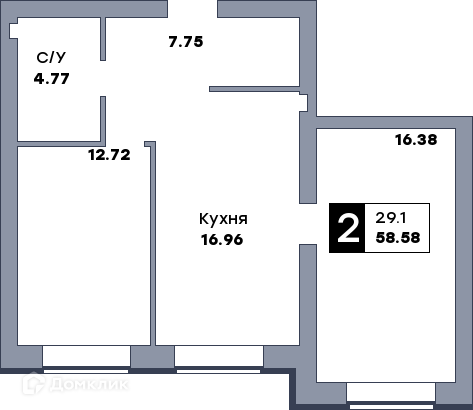 - Общая площадь: 59.6 м²
