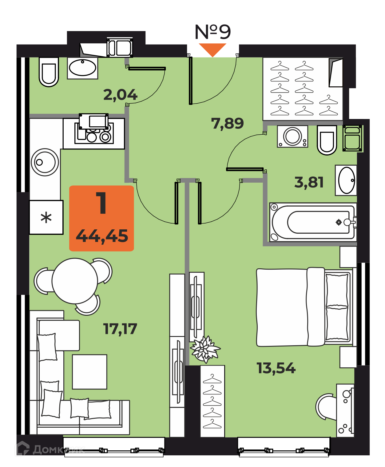 - Общая площадь: 44 м²